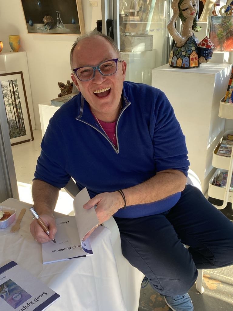 David signing copies of Small Epiphanies at the launch on 25 August 2024 at Under the Greenwood Tree Bookshop & Art Gallery Tamborine Mountain.